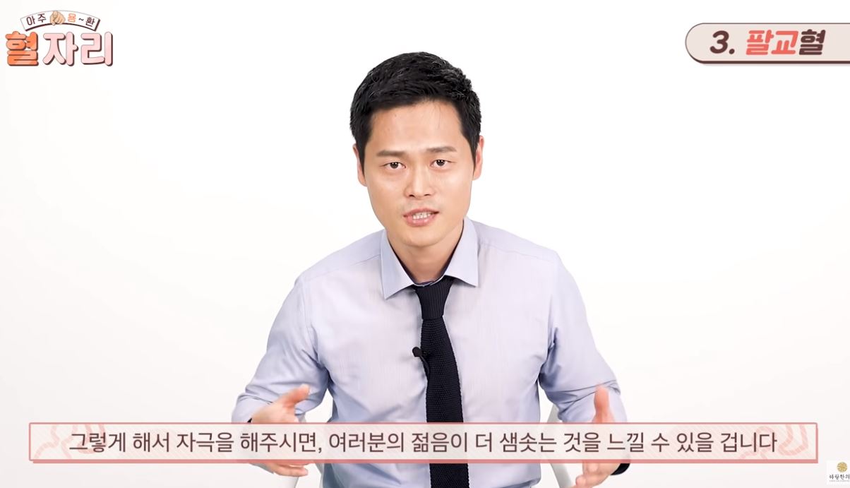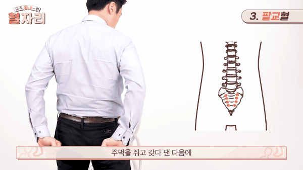 주먹을 쥐고 팔교혈 부분을 문질러 주면 됩니다. 서있는 자세 보다는 바닥에 눕거나 또는 의자에 앉아있을 때 하는 것이 효과적입니다.