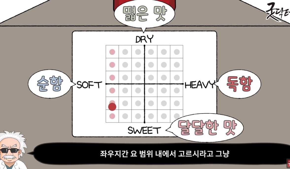 드라이와 스위트는 맛으로 드라이 쪽으로 갈수록 떫은 맛이 강하고 스위트쪽은 단맛이 강해집니다.