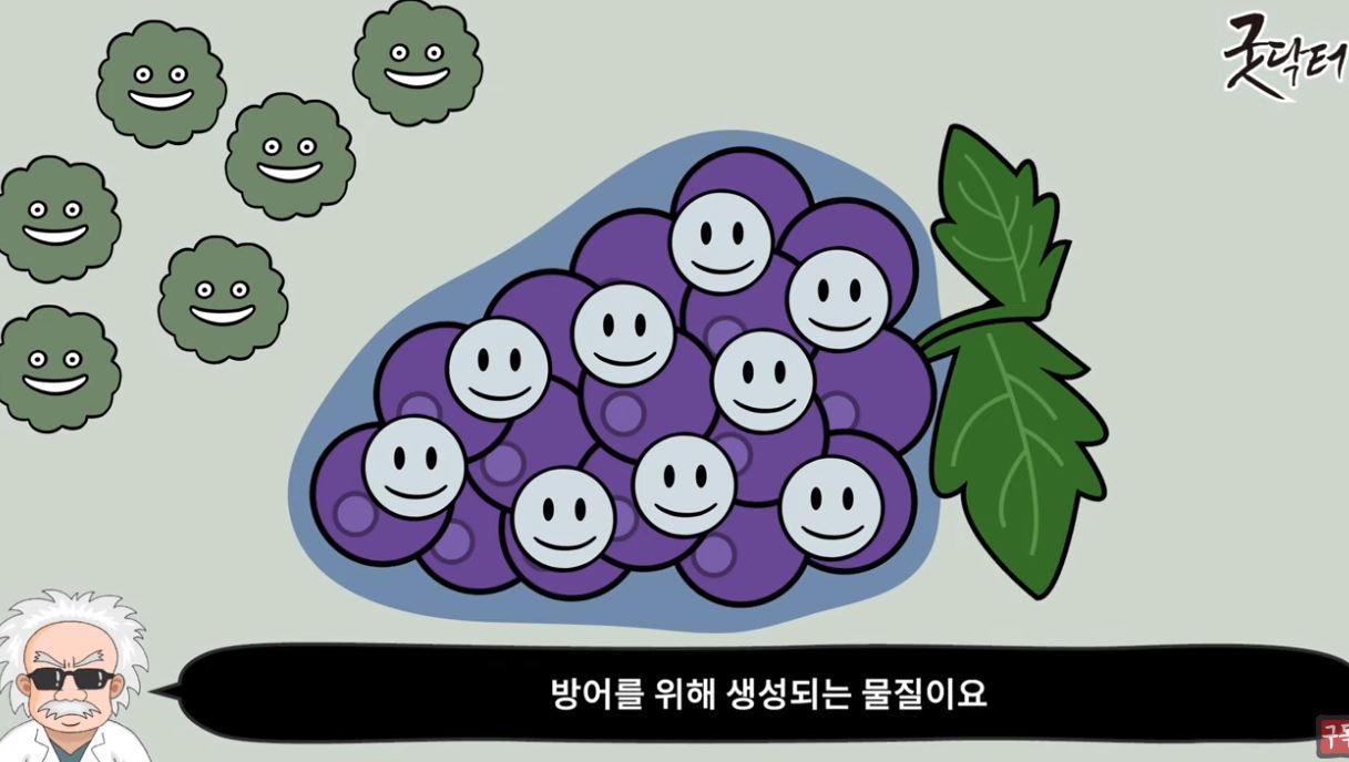 이것은 포도가 나쁜 균에 노출 되었을 때 방어를 위해 생성되는 물질로 사람에게서도 항암, 항염, 항바이러스, 항노화 같은 각종 보호효과들을 제공합니다.