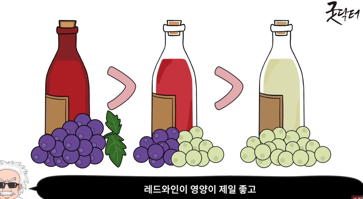 다른 대부분의 과일들도 다 그렇듯이 포도 또한 대부분의 영양이 껍질과 씨에 많이 들어 있기 때문에 영양순으로 보면 레드와인, 로제와인, 화이트와인 순입니다.