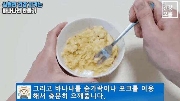 바나나를 숟가락이나 포크를 이용해서 충분히 으깨고 계란 2개를 넣어 섞어줍니다.