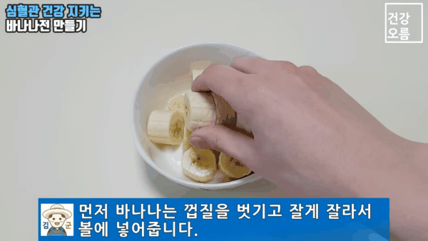 바나나는 껍질을 벗기고 잘게 잘라서 볼에 넣어줍니다.