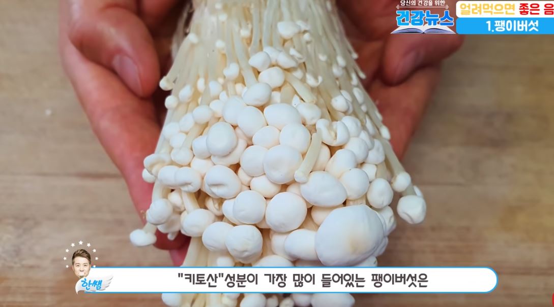 수많은 버섯 중에서도 키토산 성분이 가장 많이 들어 있는 팽이버섯은 우리 몸의 청소부로서 양배추에 2배가 넘는 식이섬유가 풍부해 혈중 콜레스테롤 수치를 낮춰줄 뿐 아니라 동맥경화를 예방하는데 많은 도움을 줍니다.