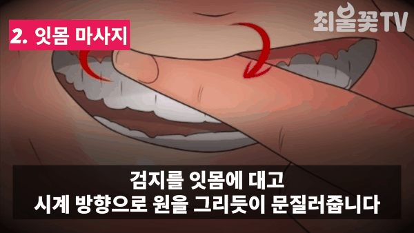 잇몸 마사지를 하는 방법은 우선 양치질을 한 뒤 손을 깨끗이 씻은 후 검지를 잇몸에 대고 시계방향으로 원을 그리듯이 문질러 줍니다.