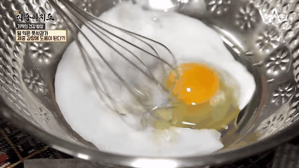 우유와 계란을 섞고 팬케이크 가루를 넣는다