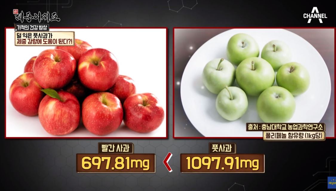 풋사과 속의 폴리페놀이라는 성분이 우리 몸 지방 합성을 억제하는 호르몬의 수치를 상승시키고 그로 인해 내장 지방이 감소한다는 여러 연구결과가 있습니다.