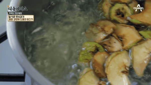 말린 풋사과 10개를 끓는 물에 5분 정도 우려낸다