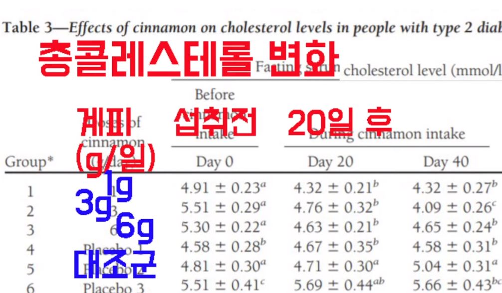 당뇨가 있는 대상자에게 일정량의 계피를 40일 동안 섭취한 결과 중성지방과 LDL콜레스테롤, 총콜레스테롤의 수치가 낮아지는 것을 확인할 수 있었습니다.