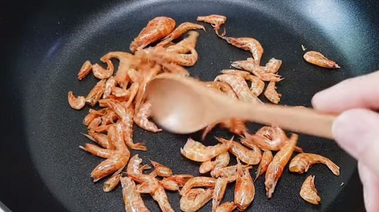 그 다음 기름을 두르지 않은 팬에 건새우를 넣고 2분간 볶습니다.