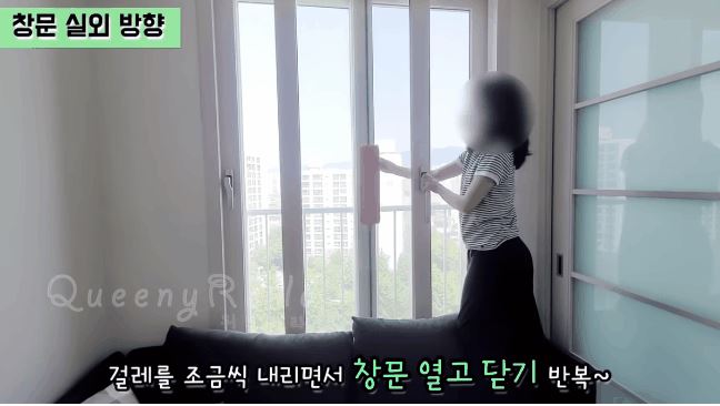 한칸씩 닦는다는 느낌으로 걸레 위치를 아래로 내리고 창문을 열고 닫고 또 걸레를 내리고 열고 닫고를 반복해 주면 됩니다.