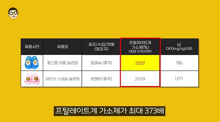 어린이 슬리퍼제품에서도 프탈레이트계 가소제가 최대 373배, 납이 3.4배를 초과하는 걸 확인할 수 있는데요.
