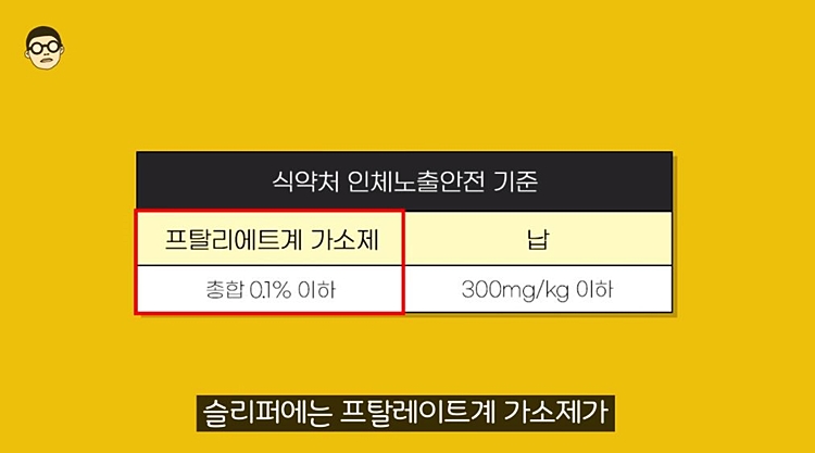 식약처의 인체노출 안전기준을 보면 슬리퍼에는 프탈레이트계 가소제가 0.1% 이하로 들어가야하고 납은 300mg 이하로 들어가야 된다고 나와있습니다.