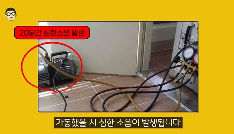 진공작업을 하려면 컴프레서가 필요하고, 보통 20분간 진행되며 컴프레서 가동 시 심한 소음이 발생됩니다.