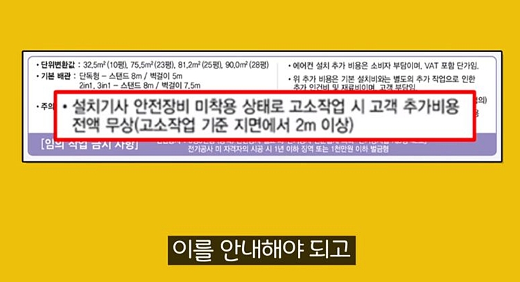 정상적인 업체에서는 안전장비를 설치해야 될 때, 고객에게 추가비용과 함께 이를 안내해야 합니다. 그리고 현장에서 이게 지켜지지 않는다면 위험수당은 100% 환불해 주도록 명시되어 있습니다.