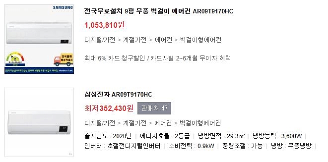 인터넷으로 에어컨가격을 검색해보면 같은 모델인데 어떤 곳은 100만원이 넘는데 또 어떤 곳은 30만원에 올라온 곳 도 있습니다.