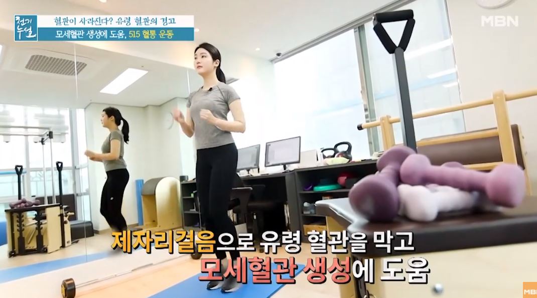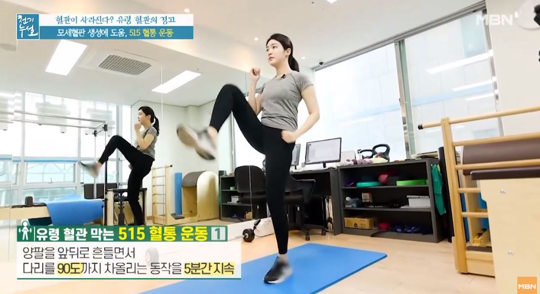 제자리에서 걸음을 걸으면 뇌에 좋은 자극을 주어 모세혈관을 생성하기 좋습니다.