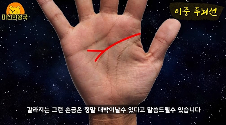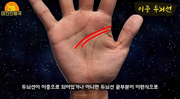 두뇌선은 사람의 IQ나 계산능력을 의미 하는데요. 두뇌선이 2개 있거나 갈라진 분들은 본인에게 오는 기회를 포착하는 능력이 보통 사람의 2배 이상 된다고 합니다.