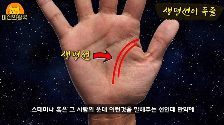 만약 생명선이 2줄이라면 사고가 나도 금방 회복할 수 있고, 몸이 아프더라도 금방 회복할 수 있는 길한 손금이라고 합니다.