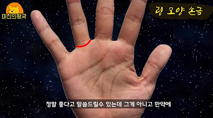 검지든 중지든 약지든 상관없이 손가락 마디 밑에 링 모양의 고리선이 있으면 그분은 재물이나 명예, 인기를 누릴 수 있고 본인의 자리에서도 획기적인 성과를 거둘 수 있다고 합니다.