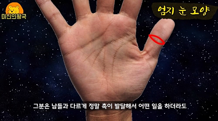 엄지손가락에 동그란 눈처럼 생긴 모양이 있는 경우입니다.