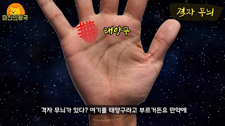 또한 아래사진처럼 태양구에 격자 무늬가 있는 경우라면 명예나 인기를 얻어 부자가 되는 손금이라고 합니다.