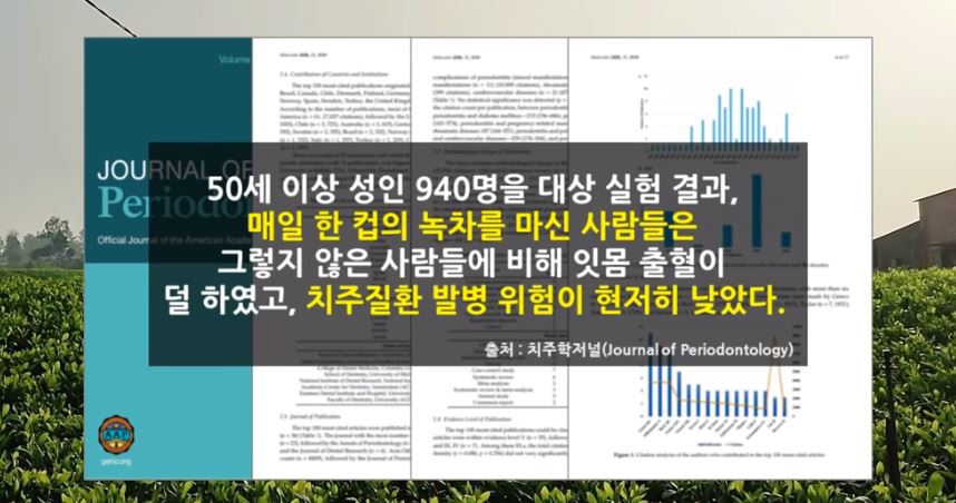 치주학 저널에 실린 연구에 따르면 50세이상 성인 940명을 대상으로 실험한 결과 매일 한 컵의 녹차를 마신 사람들은 그렇지 않은 사람에 비해 잇몸 출혈이 덜 하였으며 치주 질환 발병 위험이 현저히 낮았다고 밝혔습니다.