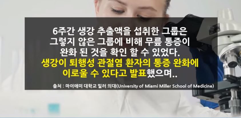 미국 마이애미 의대 연구팀에 따르면 6주간 생강을 꾸준히 섭취한 그룹은 그렇지 않은 그룹에 비해 관절염으로 인한 통증이 완화 되었다고 밝혔습니다.