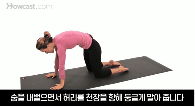 허리를 구부리고 확장할 때 무릎과 팔이 지지대 역할을 하기 때문에 허리에 안전한 동작입니다.