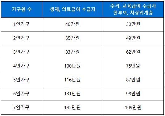 생계, 의료급여 수급자의 경우 가구당 40만원~최대 145만원이 지급되며, 이 외에는 30만원~최대 109만원이 지급됩니다.