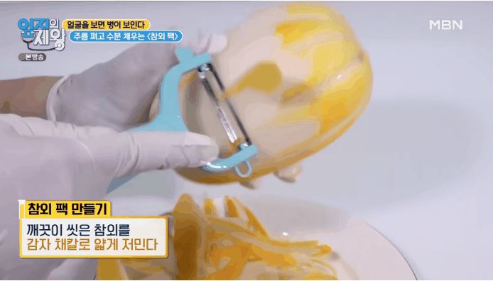 주름 부위에 참외 팩을 5분간 붙인다