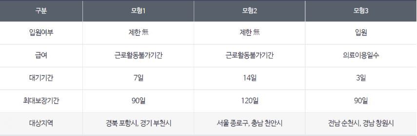 해당 지역 취업자는 질병이나 부상 등으로 일하지 못할 경우 해당 기간 동안 하루 43,960원을 받게 되며, 아래와 같이 3가지 모형으로 우선 실시 됩니다.
