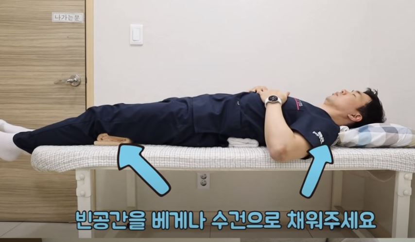 이런 상태에서는 목 뒤쪽과 무릎 뒤쪽이 바닥으로부터 떨어져 불편할 수 있는데, 빈공간을 베개나 수건으로 채워주면 편안하게 요추전만을 유지하면서 잘 수 있습니다.