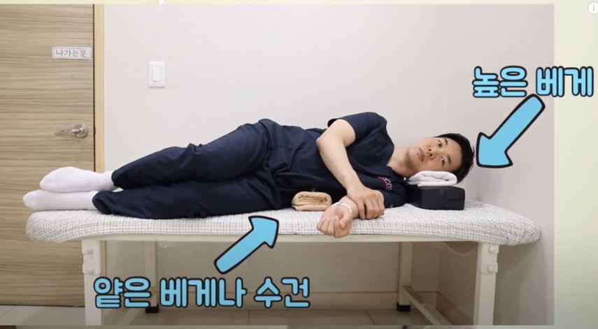 옆으로 누운 자세는 똑바로 누워 잘때처럼 허리를 쭉 편 상태를 유지하기가 쉽지 않은데요, 이럴 때는 한쪽으로 허리가 휘어지지 않게 꼭 허리에 얕은 베개 또는 수건을 받쳐 줘야 합니다.