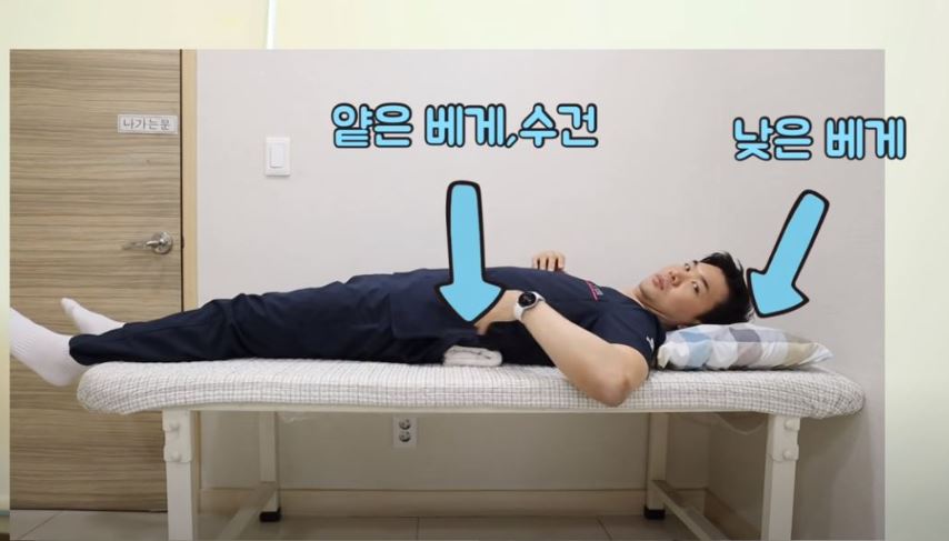 첫번째는 똑바로 누워서 낮은 베개를 베고 허리에 얕은 베개나 수건을 대고 자는 자세입니다.