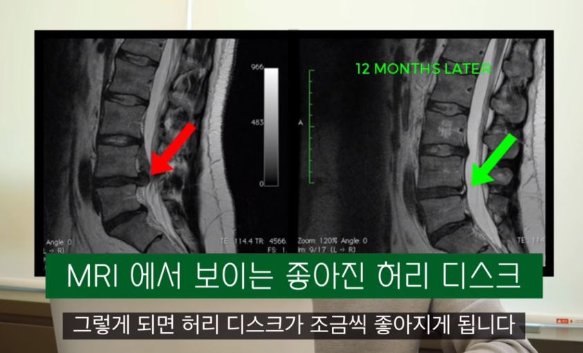 허리를 펴는 요추전만을 유지하면 디스크 뒤쪽의 찢어진 섬유륜 부분을 붙게 할 수 있고, 이로 인해 허리 디스크가 조금씩 좋아지게 됩니다.