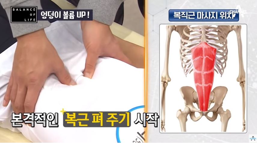 짧아진 복근을 마사지하면 근육이 이완 되면서 누워 있는 골반을 세울 수 있습니다.