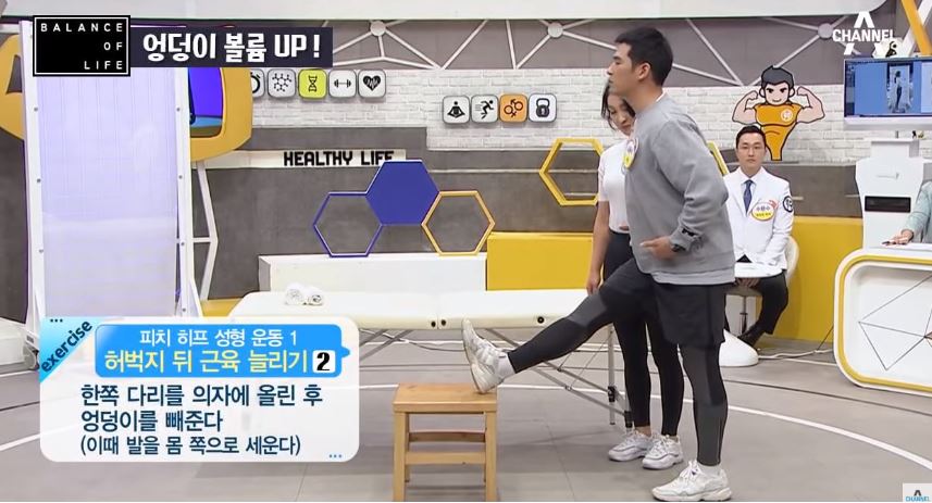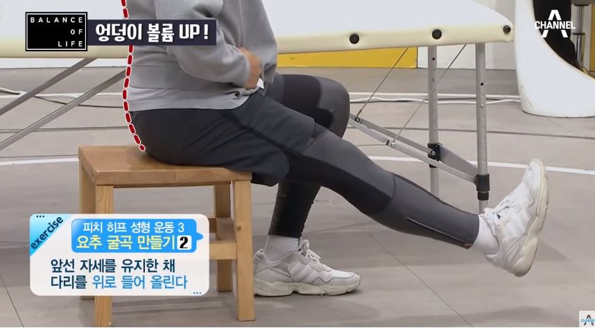 한쪽 다리를 의자에 올린 후 엉덩이를 빼준다(발은 몸쪽으로 세우기)