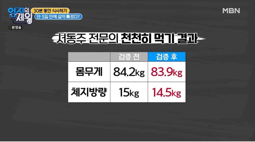 체중은 3kg 가까이 증가했고 체지방량은 1.5kg이나 증가했는데요, 음식을 빨리 먹다보니 허한 느낌이 들어서 간식을 자주 먹게 되었다고 합니다.