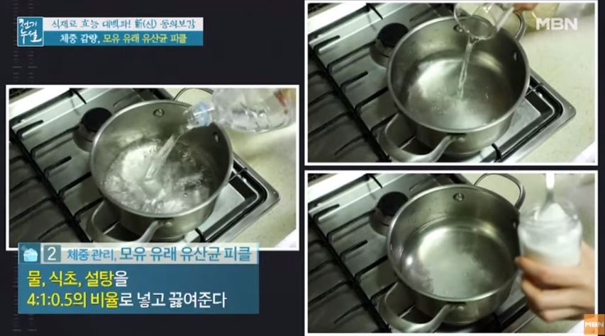 2. 물,식초, 설탕을 4:1:0.5의 비율로 넣고 끓입니다.
