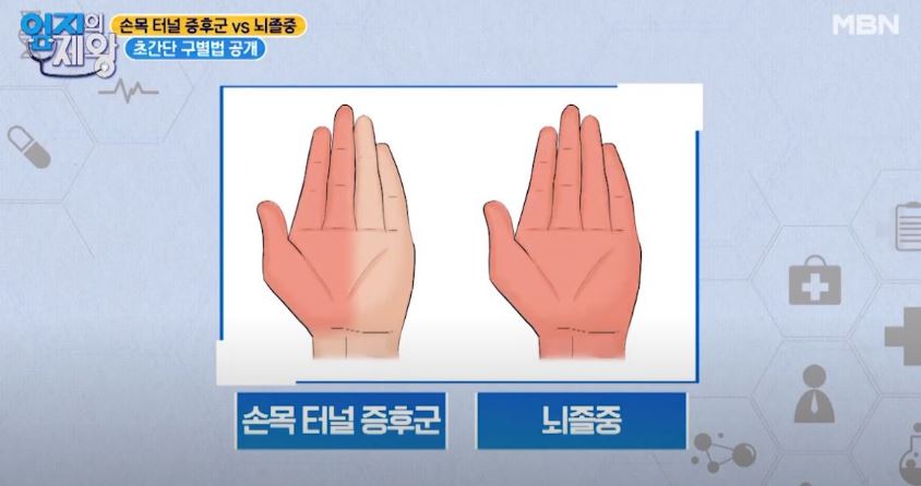 그래서 엄지 검지 중지를 중심으로 손바닥 전체의 절반만 저리다면 손목 터널 증후군, 손바닥 전체적으로 저리다면 뇌졸중을 의심해볼 수 있습니다.