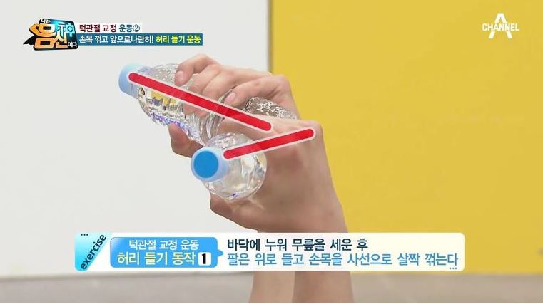 시선은 정면, 물병을 들었다 내리는 동작을 20회 반복합니다.