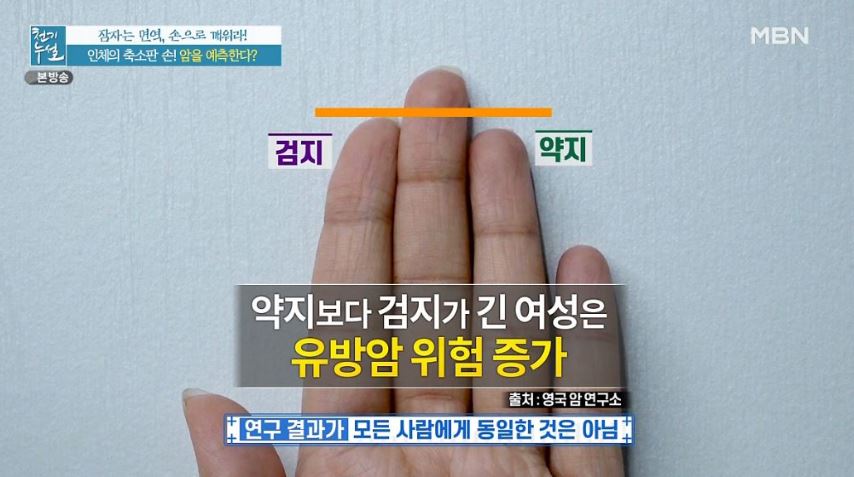검지와 약지의 길이를 비교하면 되는데 약지보다 검지가 긴 여성은 유방암 위험이 증가한다고 합니다.