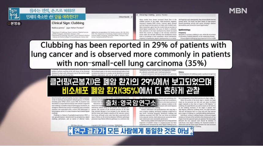 저렇게 손톱과 손가락이 만나는 지점의 각이 없어질 때는 폐암 혼자 29%에서 보고된 현상이며, 비소세포 폐암 환자에선 무려 35%나 흔하게 관찰이 되었다고 합니다.