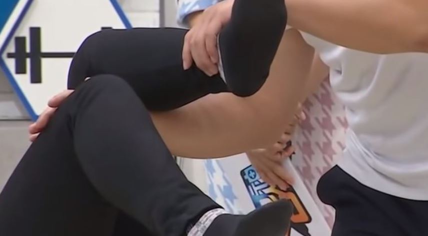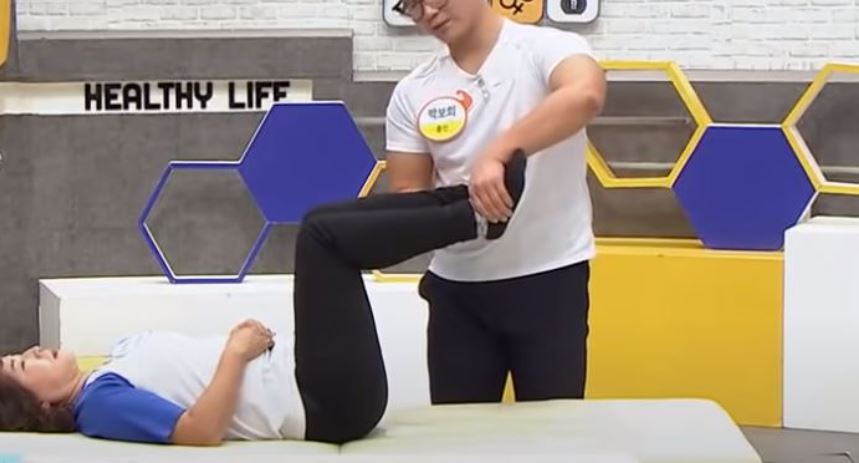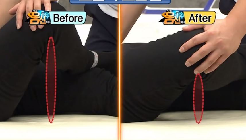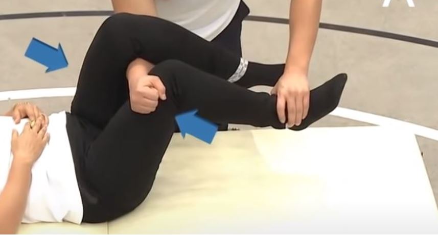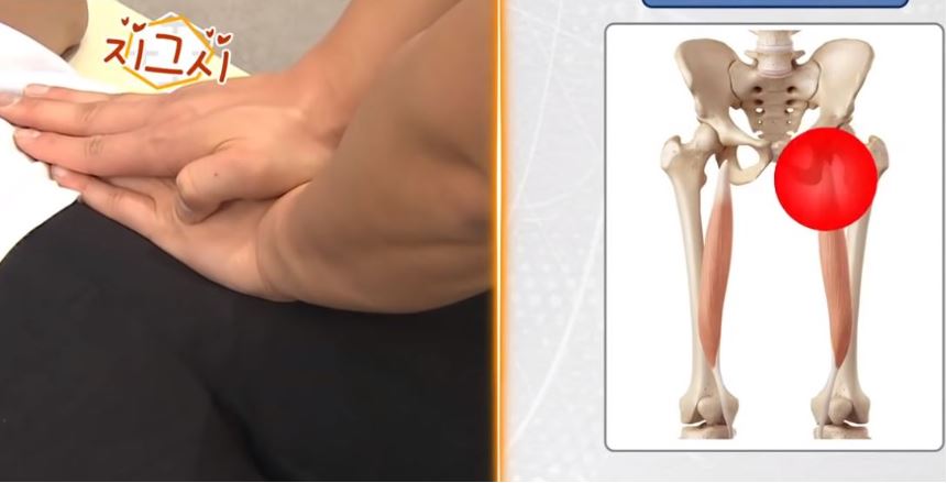 한쪽 엉덩뼈 튀어나온 밑부분의 대퇴직근이 시작하는 부위를 누른다(양쪽 10초씩)