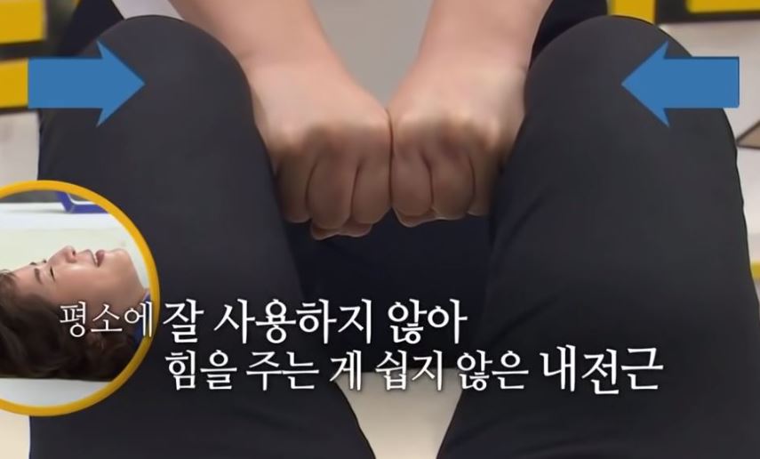 2. 무릎 사이에 두 주먹을 대고 천천히 힘을 줘 꽉 조여 준다(15초 유지)