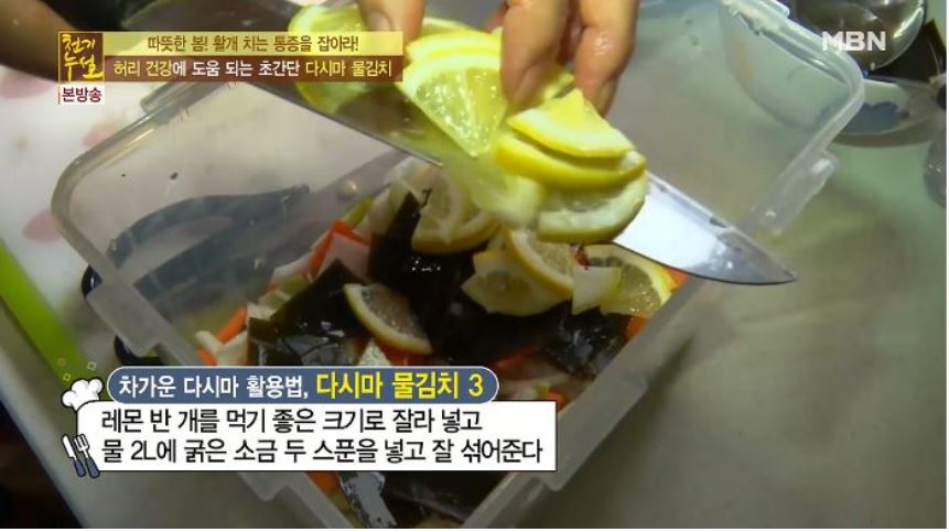 레몬을 다시마 물김치에 넣어주면, 다시마의 비린내도 잡아주고 근육을 구성하는 콜라겐의 생성을 도울 수 있습니다.