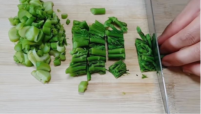 4. 두릅의 줄기 부분은 0.5cm 이하로 잘게 다지고 잎부분은 조금 크게 잘라 준다