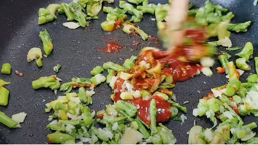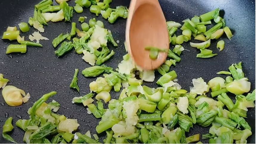 6. 두릅과 마늘이 익었으면 불을 끄고 준비한 양념장을 넣고 잘 섞어준다