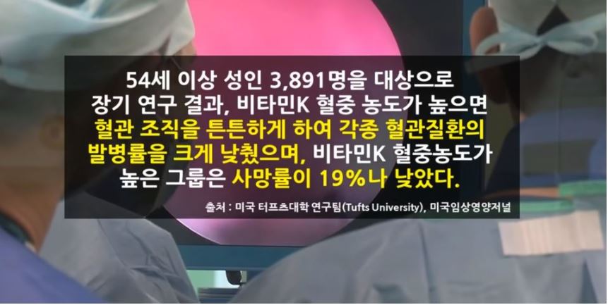 미국 터프츠 대학 연구팀은 54세 이상 노인 3891명을 대상으로 장기간 연구한 결과 혈중 비타민k 농도가 높은 사람들은 그렇지 않은 사람에 비해 혈관 질환 발병률이 크게 낮았으며 사망률 또한 19%나 낮았다고 밝혔습니다.