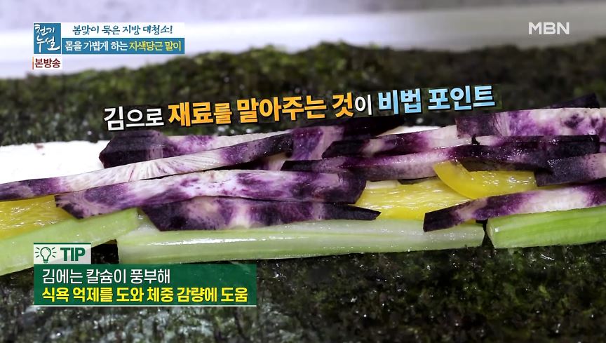 김 또한 칼슘이 풍부해 체중 감량에 도움이 됩니다. 잘 말아준 후 한 입 크기로 썰어주면, 포만감도 있고 체중 감량에 도움도 되는 자색당근말이가 완성됩니다.